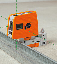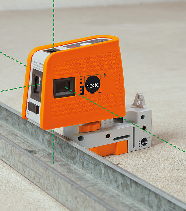 Láser de 5 puntos con autonivelación que genera tres puntos láser horizontales y dos verticales: delante, a la izquierda, a la derecha, arriba y abajo. Los puntos láser están dispuestos en ángulo recto exacto entre sí. Los puntos láser horizontales se encuentran todos a la misma altura. Ideal para nivelar, alinear, aplomar y aplanar ángulos rectos con rapidez.
