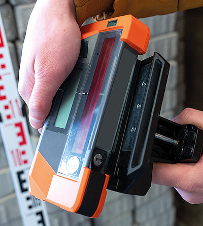 Das FlatBack Design des COMMANDER 3 ermöglicht das flache Anlegen des Laserempfängers mit montierter Heavy-Duty Halteklammer an einer Wand.
