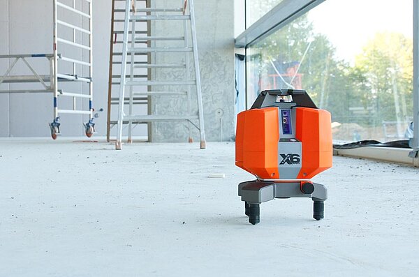 Der symmetrische Aufbau des X-Liner 6 green, der integrierte Feintrieb und der Lotstrahl ermöglichen eine schnelle Achsausrichtung. Dank der robusten Füße aus Metall kann der Laser zum Fluchten und Abtragen rechter Winkel über Trockenbau-Profilen aufgestellt werden.